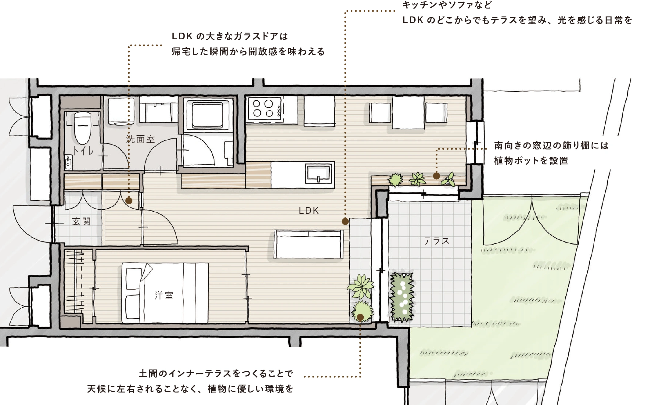 - 陽当たり良好な南向きの専用庭