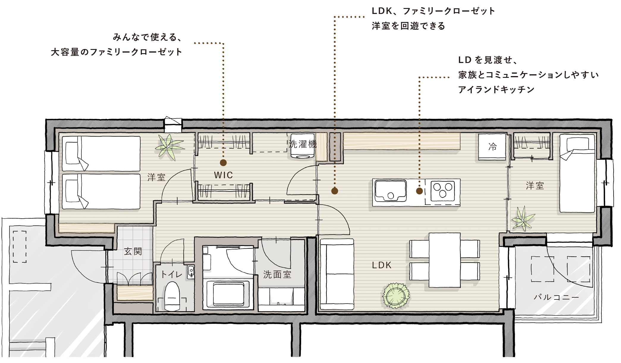 - 廊下をなくし、専有面積を最大限に活かした3LDK